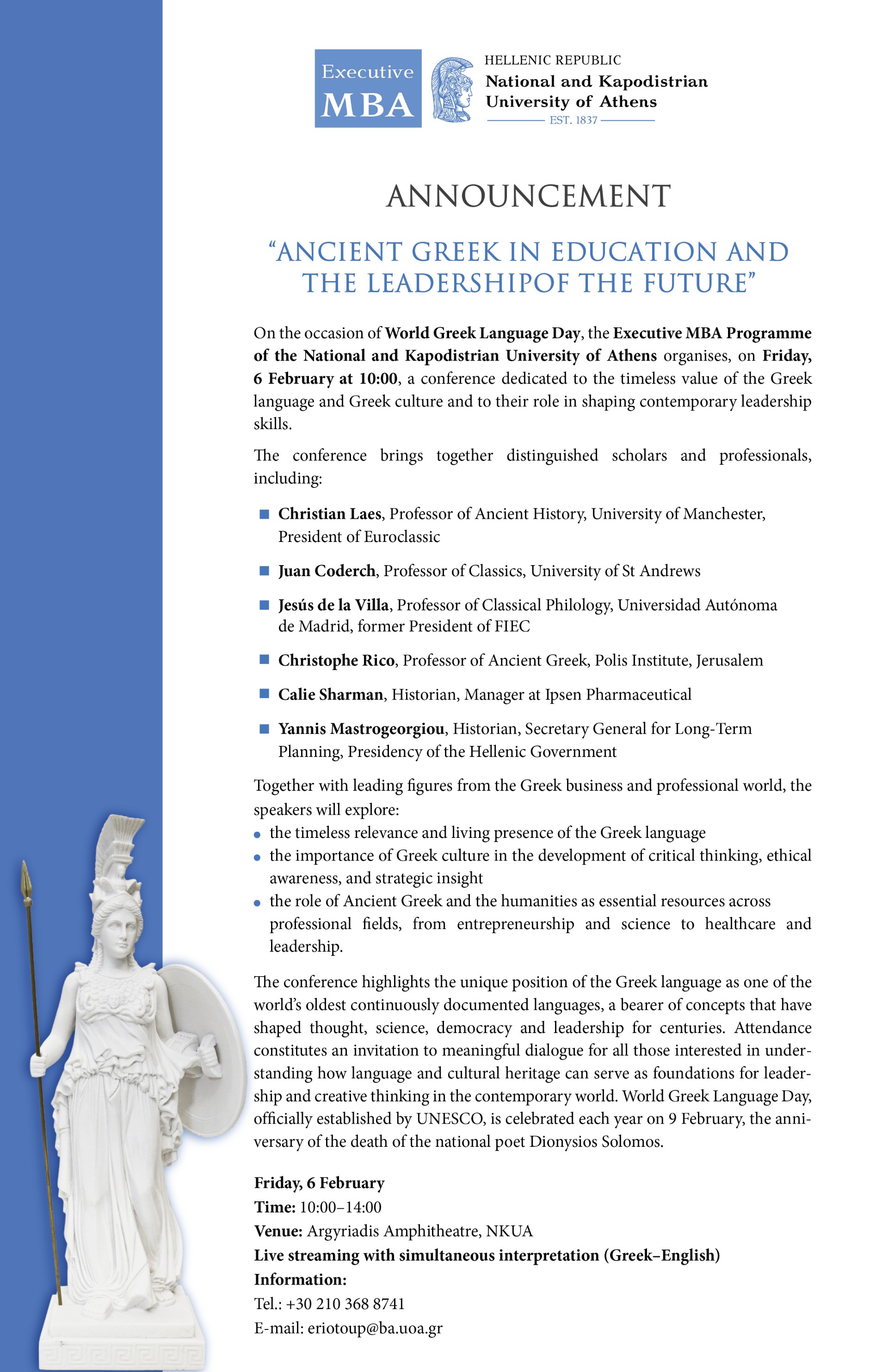 6 February, Greek Language Day, at the National and Kapodistrian University of Athens. Of course, Euroclassica participates! Please join our president — online streaming will be provided, just confirm via the indicated e-mail address.